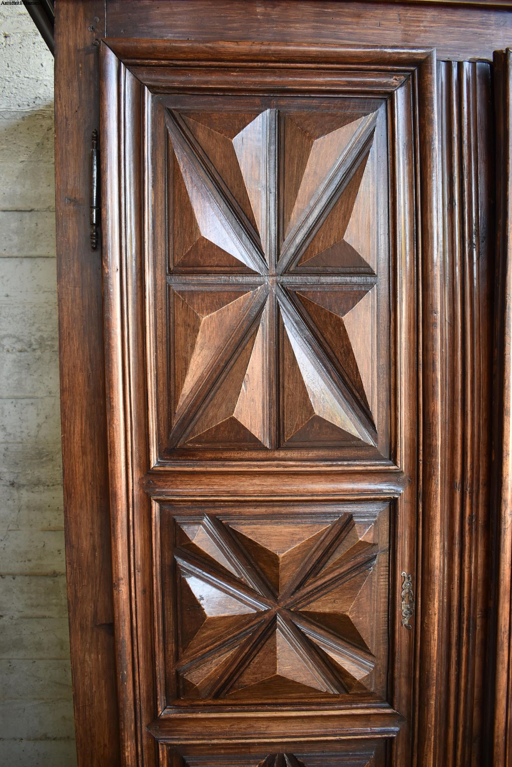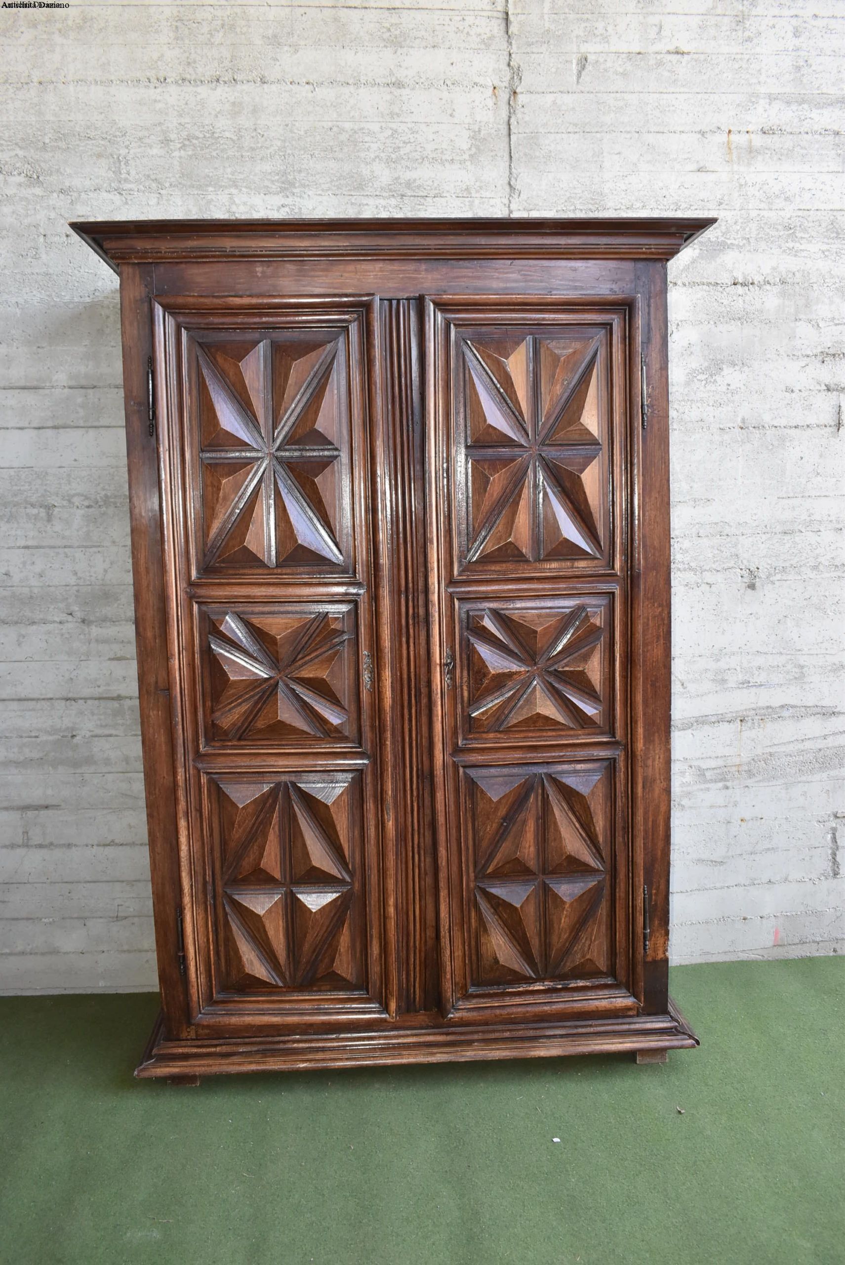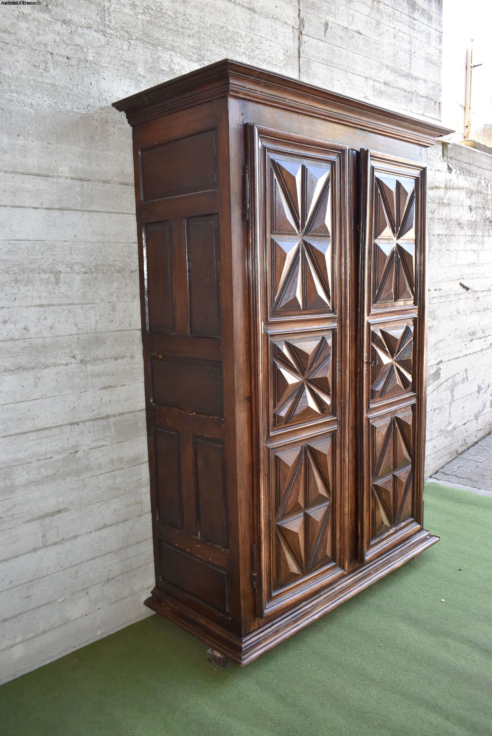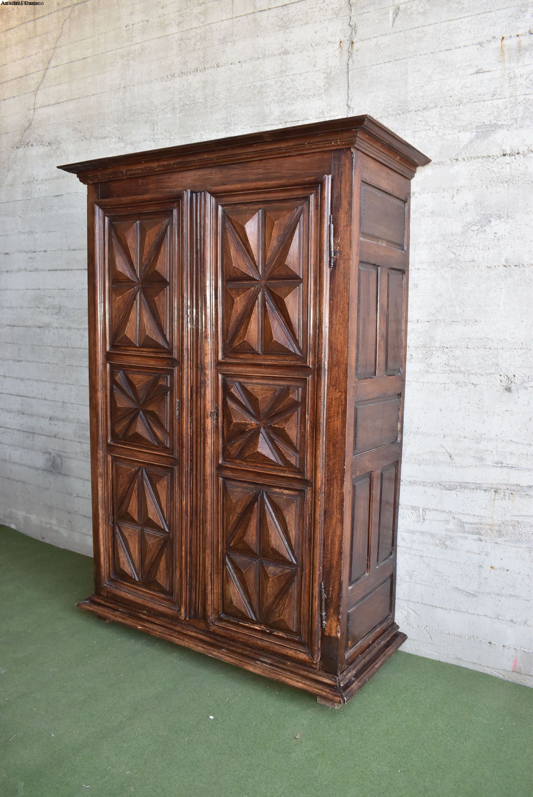 frontale in noce, pannelli laterali in rovere; intagliato con motivo a punta di diamante, apertura a 2 ante, serramenti originali. 700.