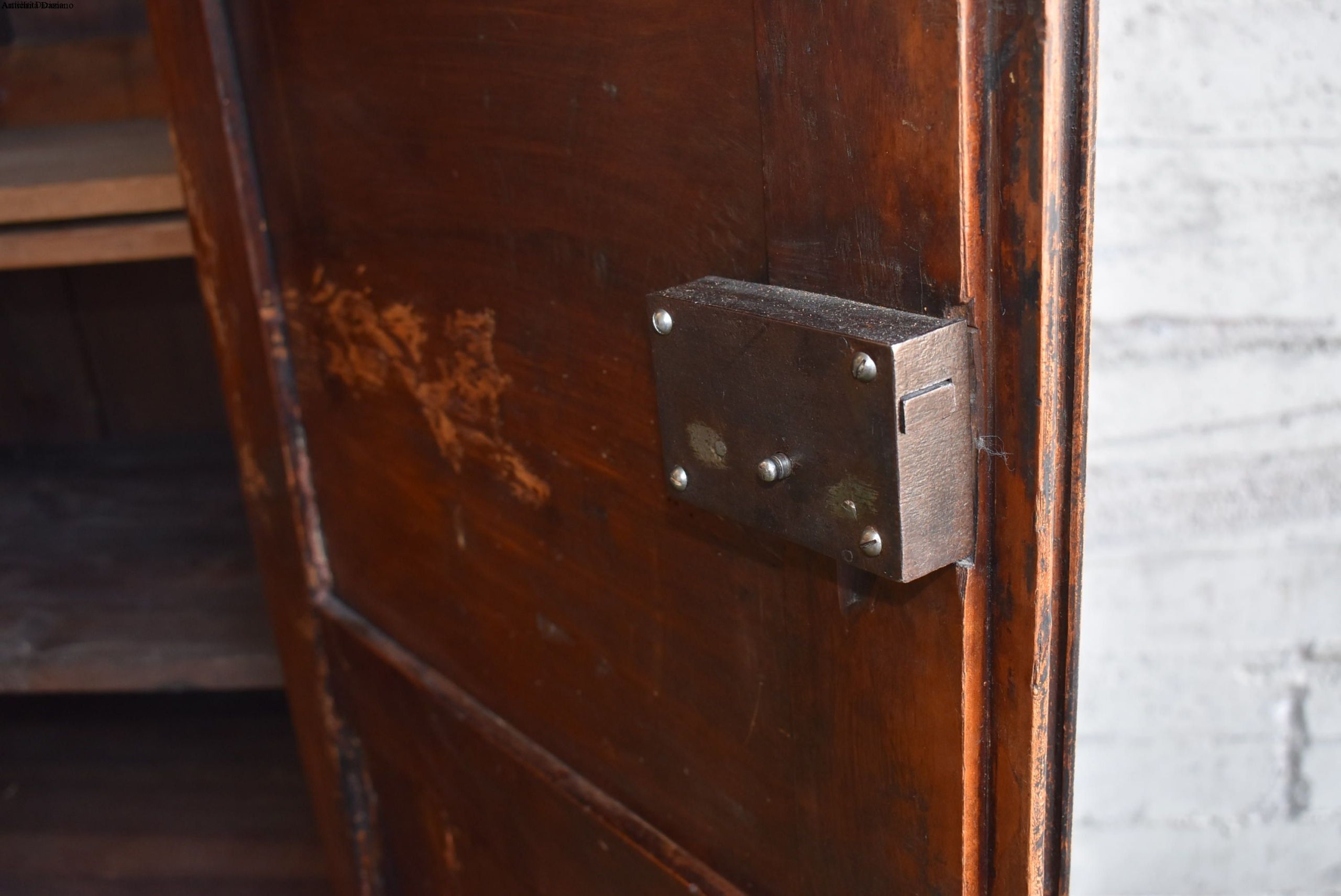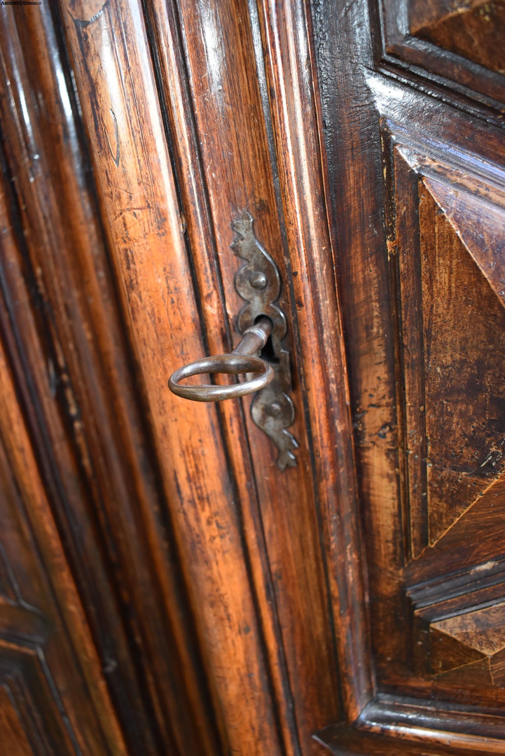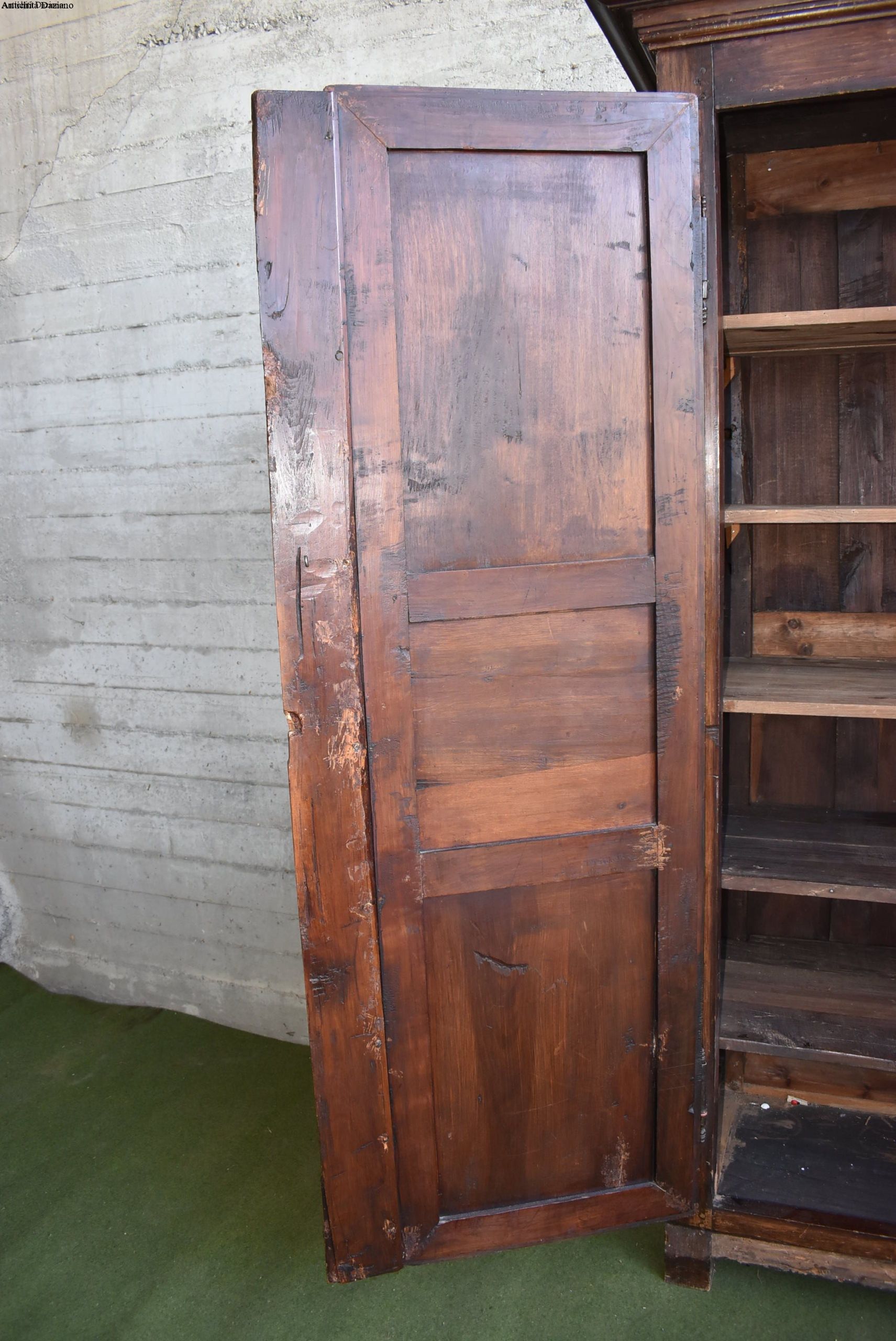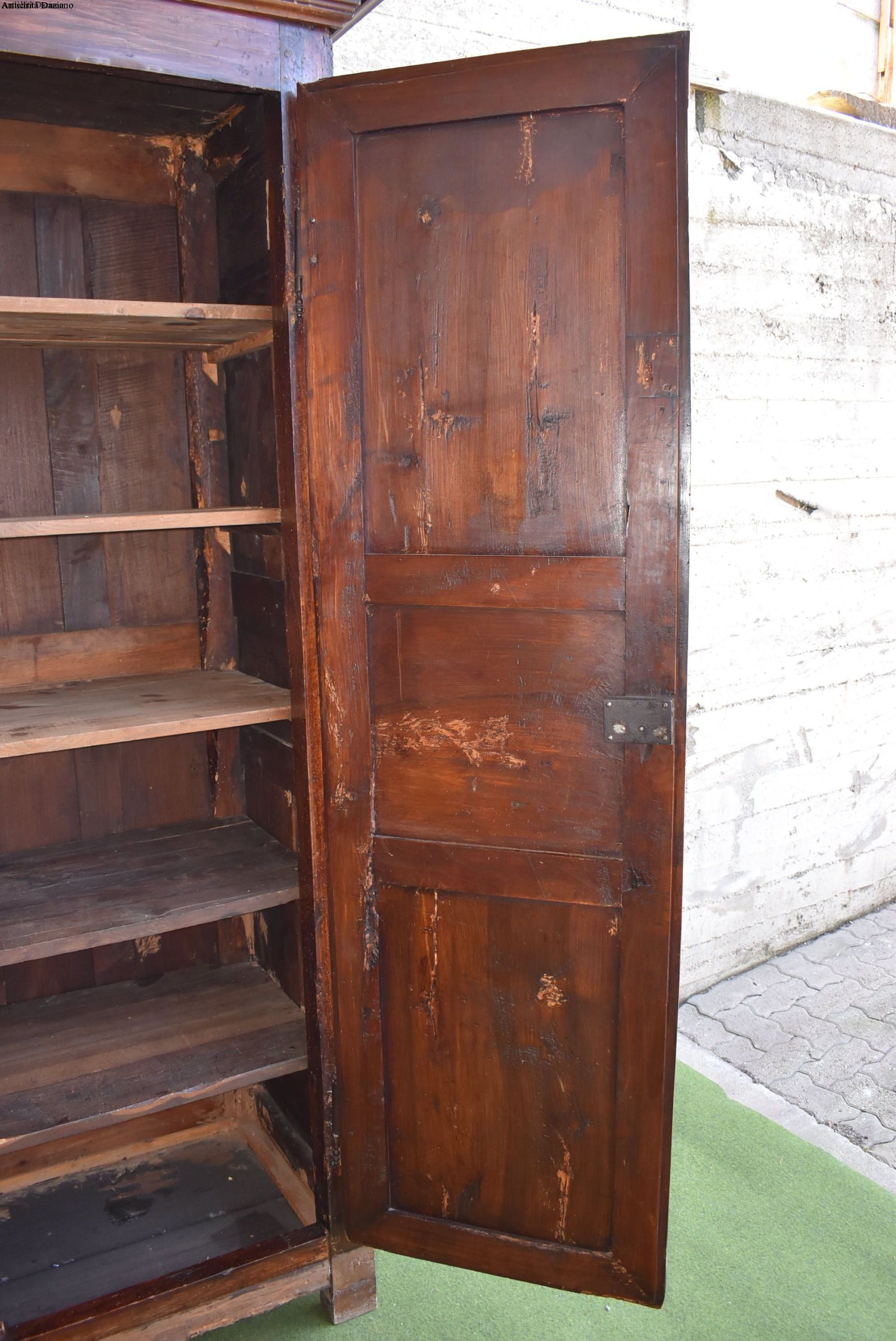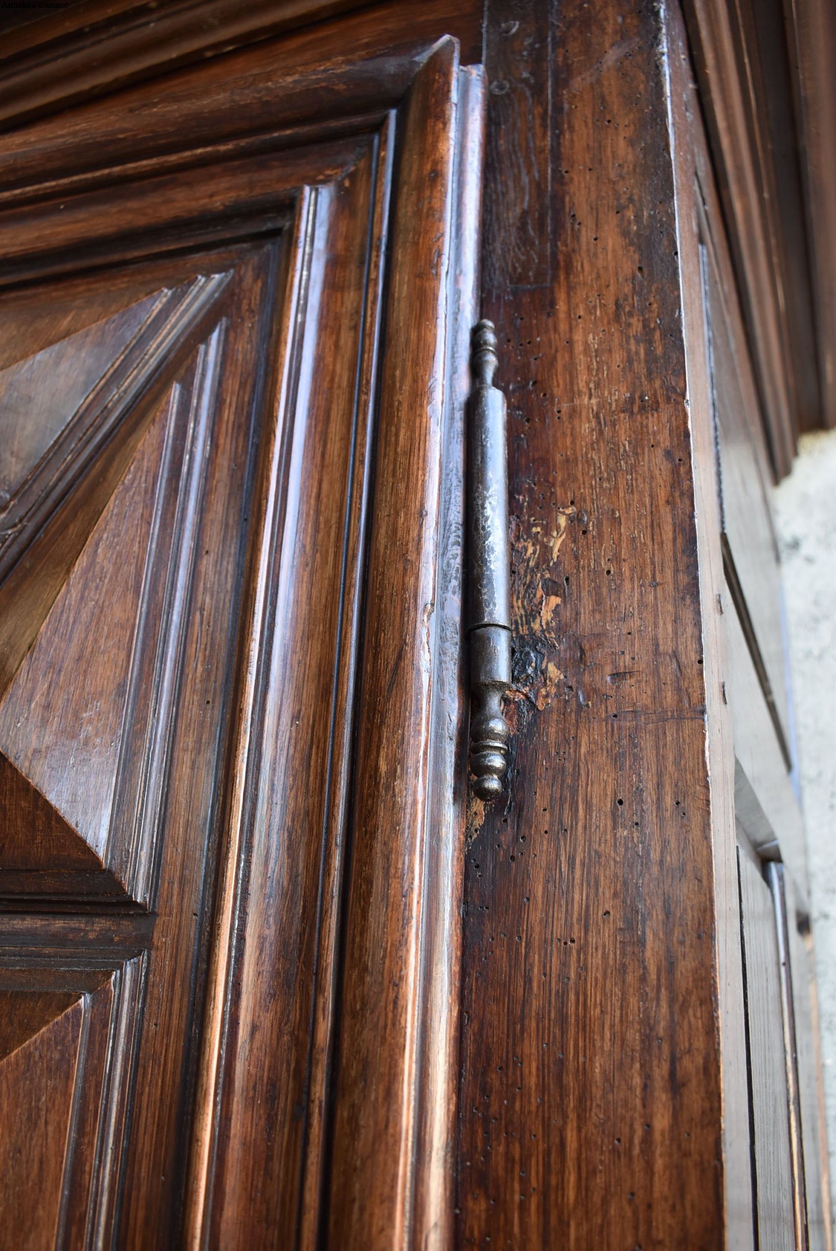 frontale in noce, pannelli laterali in rovere; intagliato con motivo a punta di diamante, apertura a 2 ante, serramenti originali. 700.