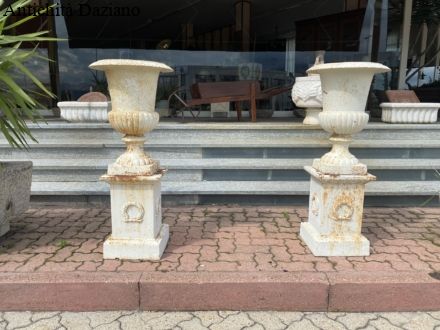Presentazione dell’ esposizione arredo da esterno: tavoli in ferro e pietra, fontane in marmo e ghisa, colonne in marmo, vasche in pietra, cancelli ed inferriate in ferro