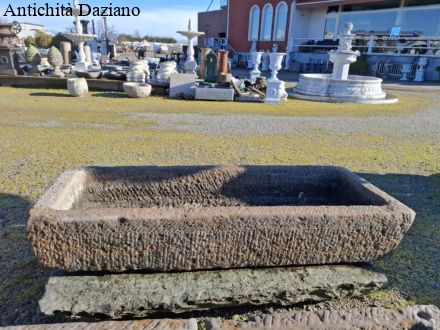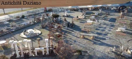 Presentazione dell’ esposizione arredo da esterno: tavoli in ferro e pietra, fontane in marmo e ghisa, colonne in marmo, vasche in pietra, cancelli ed inferriate in ferro