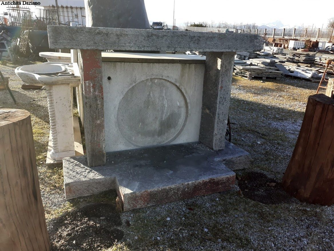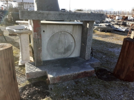 Dimensioni esterne: H totale 132 cm -Spessore 15 cm – Larghezza piano 180 cm – Larghezza esterno colonne 140 cm -Profondità 50 cm – P massima 80 cm