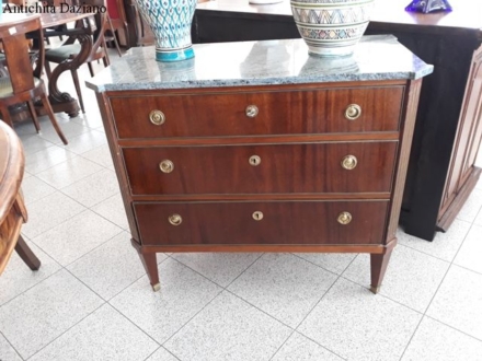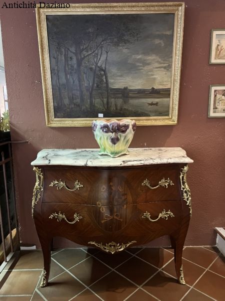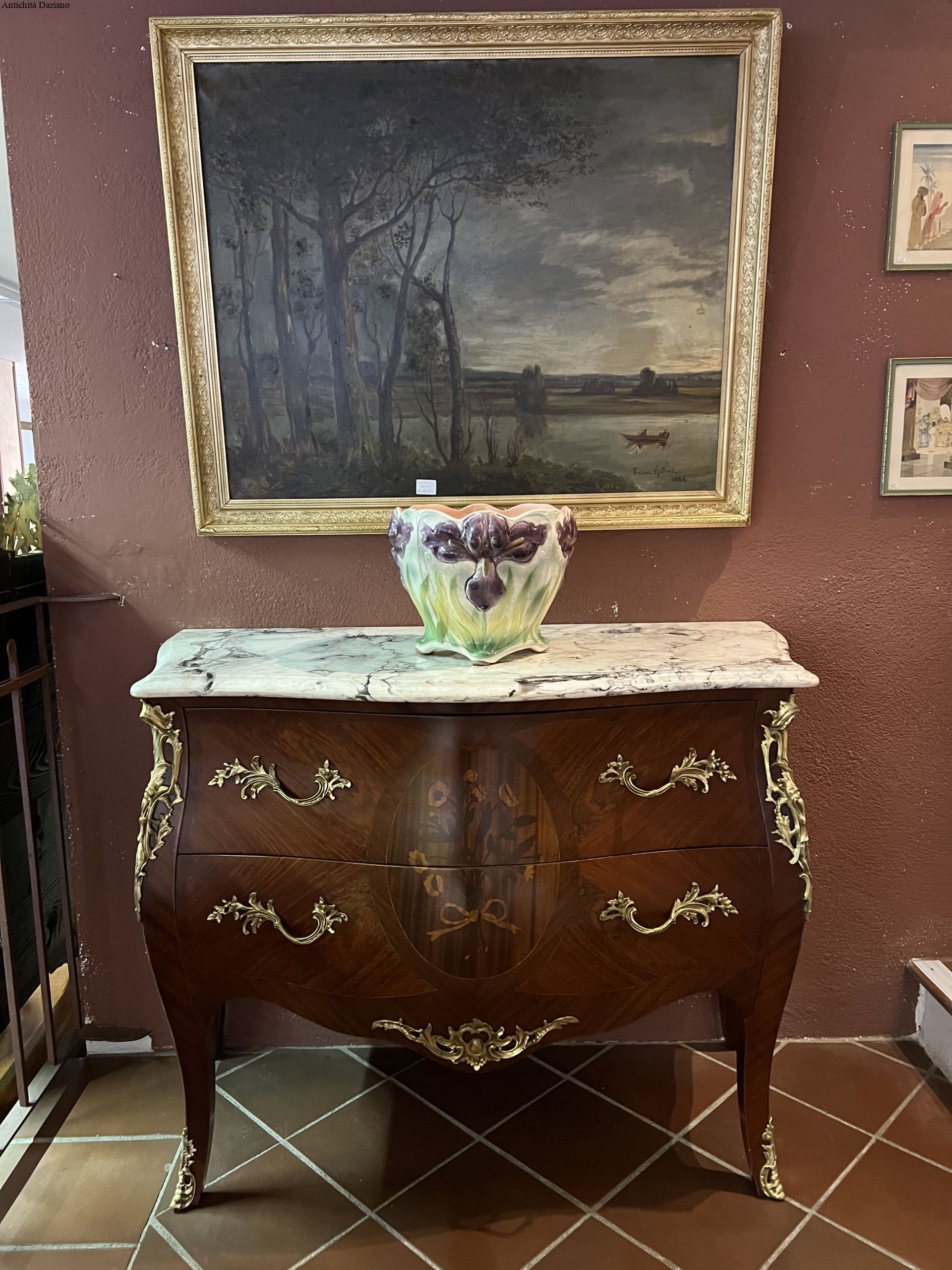 Comò bombato stile Luigi XV  in legno di palissandro e bois de rose con intarsio floreale centrale.