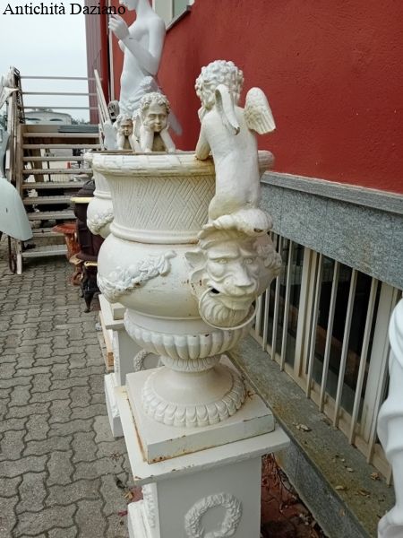 Dimensioni: Altezza totale compreso putti con piedistallo 155 cm – Altezza solo vaso compreso putti 94 cm – Apertura vano vaso diamentro 41 cm – Peso del vaso 86 Kg