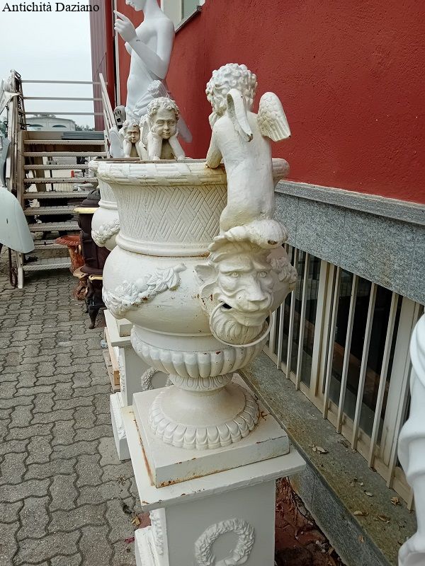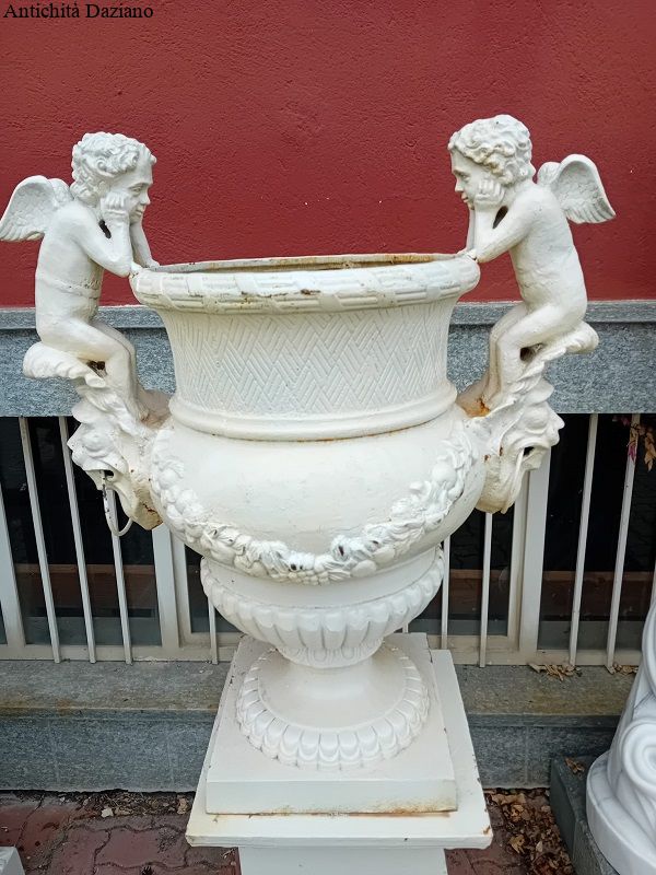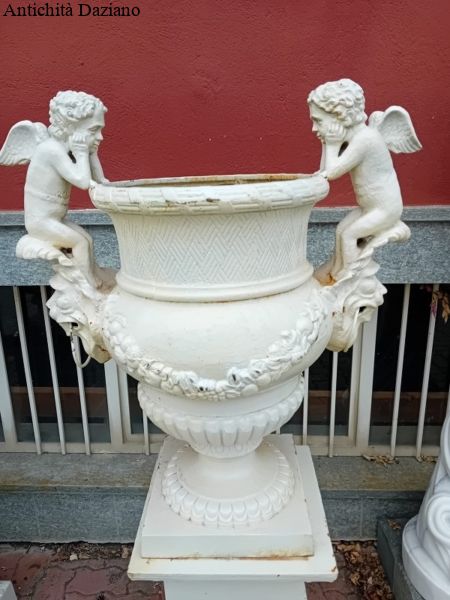 Dimensioni: Altezza totale compreso putti con piedistallo 155 cm – Altezza solo vaso compreso putti 94 cm – Apertura vano vaso diamentro 41 cm – Peso del vaso 86 Kg