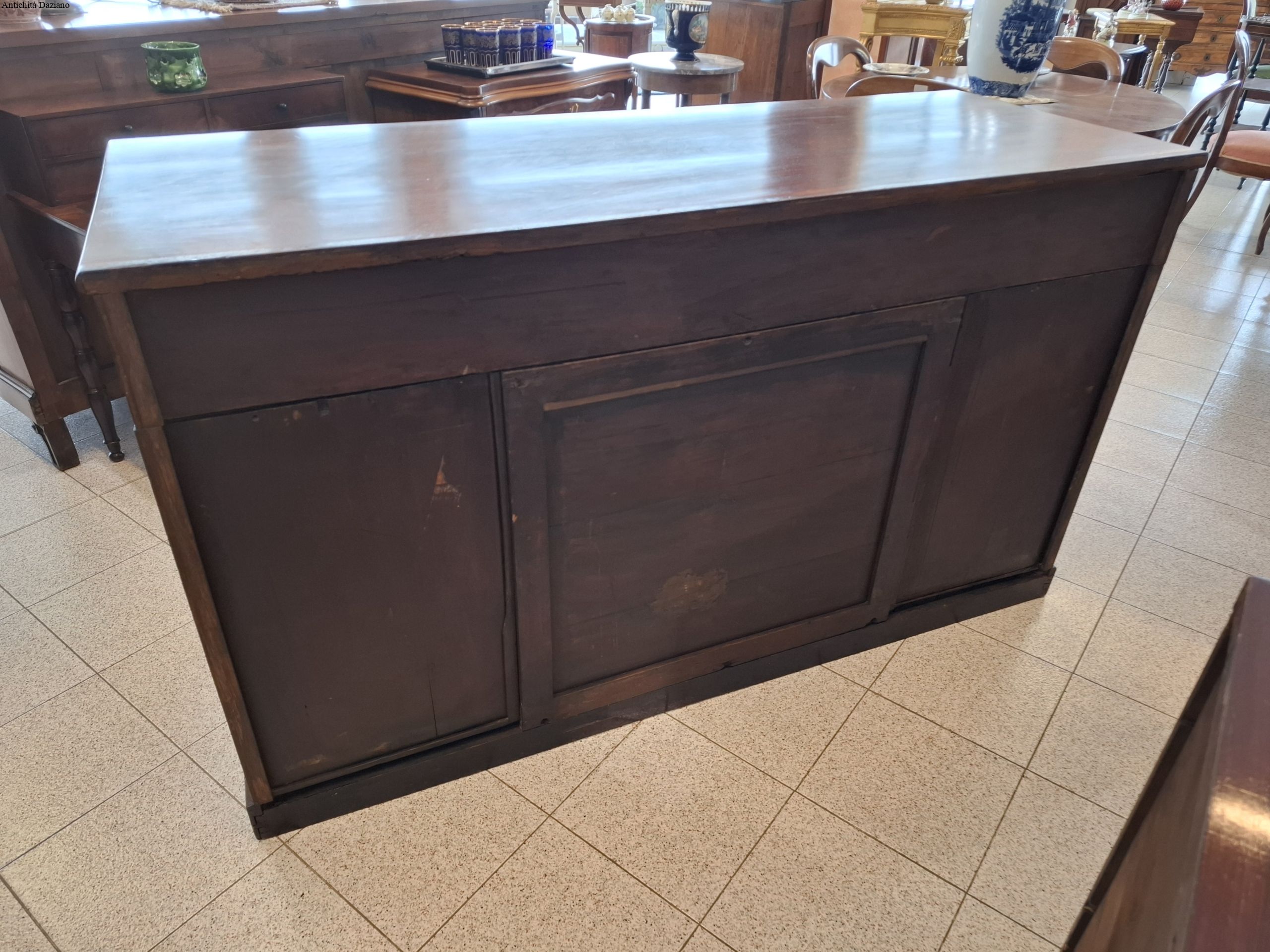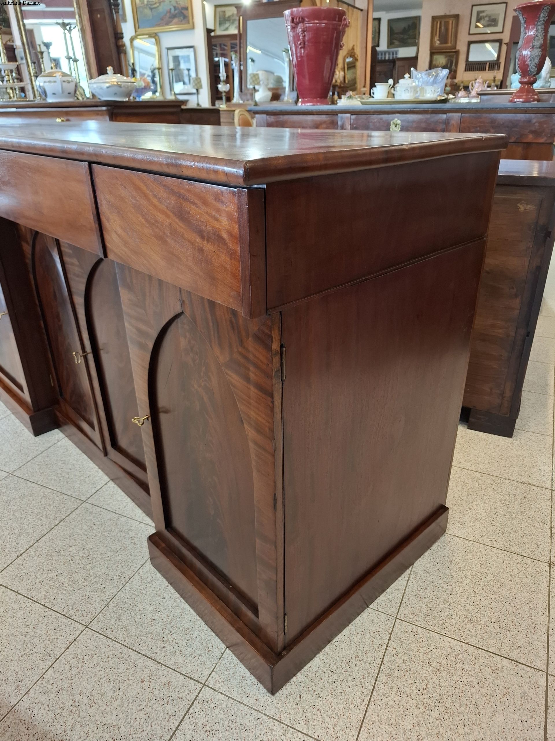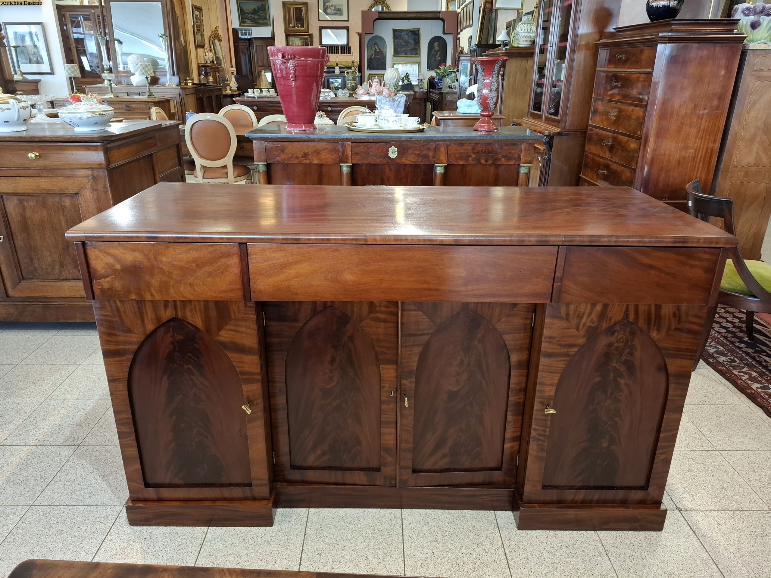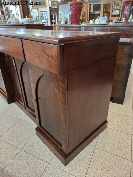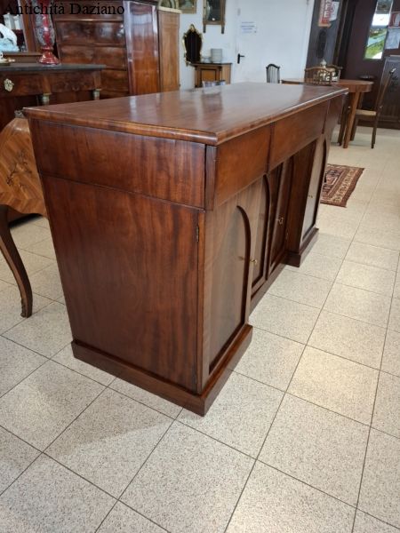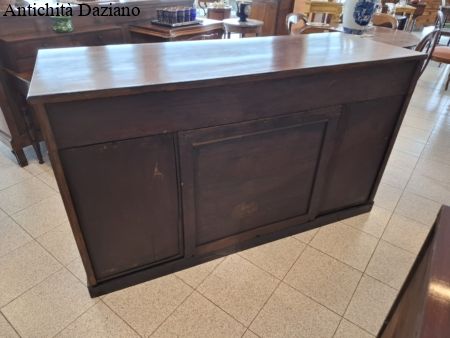 con 3 cassetti nella parte superiore, in quella inferiore 2 sportelli laterali ed un doppio sportello al centro.
