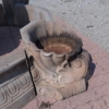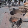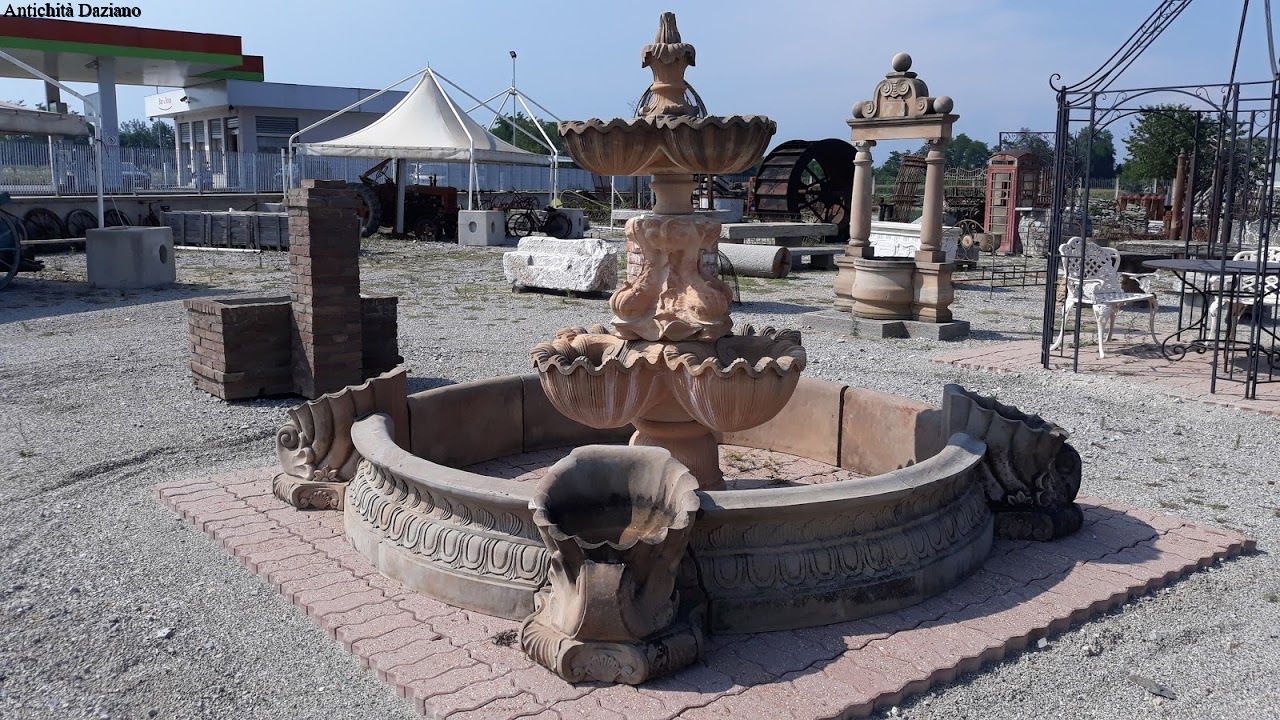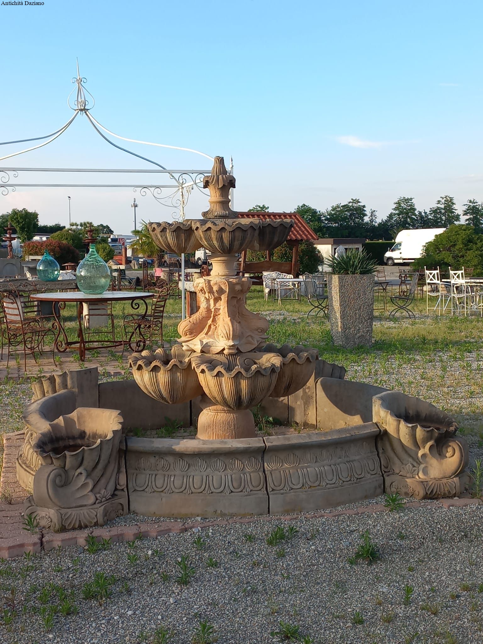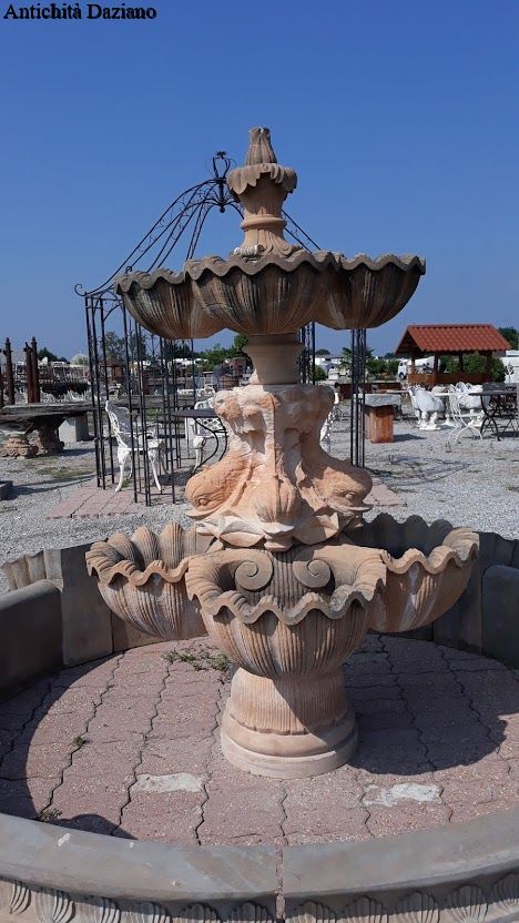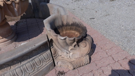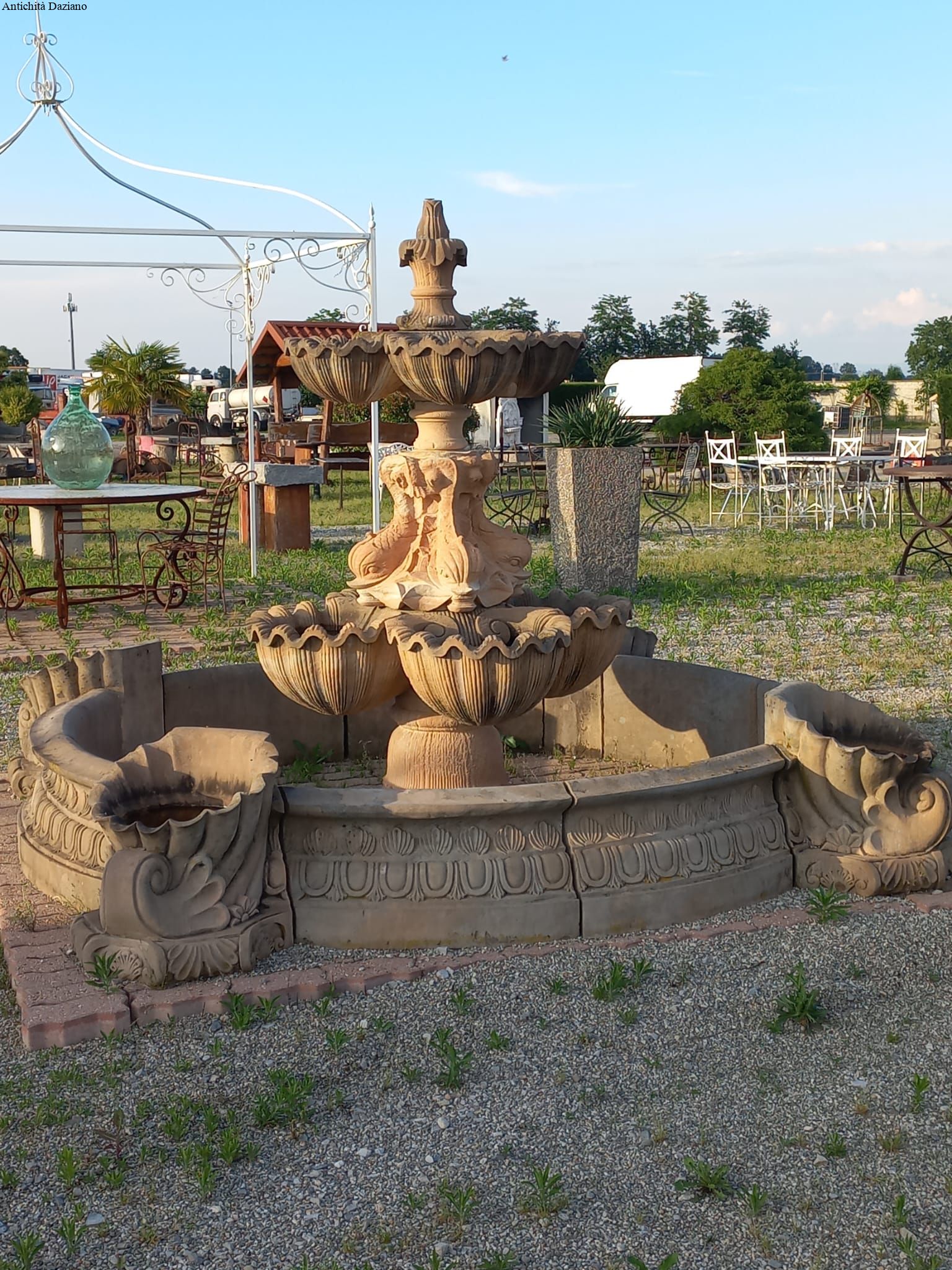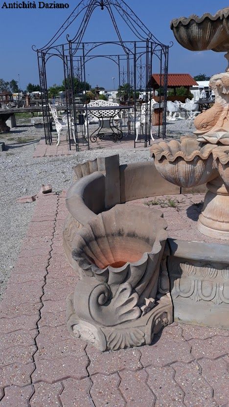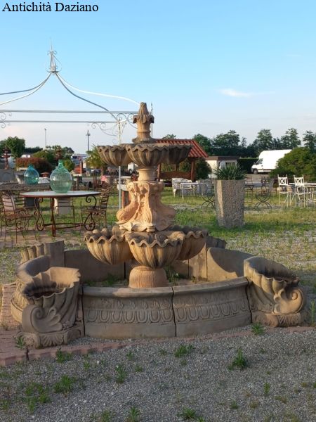 Dimensioni: diametro  esterno max 325 cm compreso cornucopie, diametro interno 203 cm – H. fontana centrale 215 cm, H. bordura 41 cm, H. cornucopie 51 cm.
