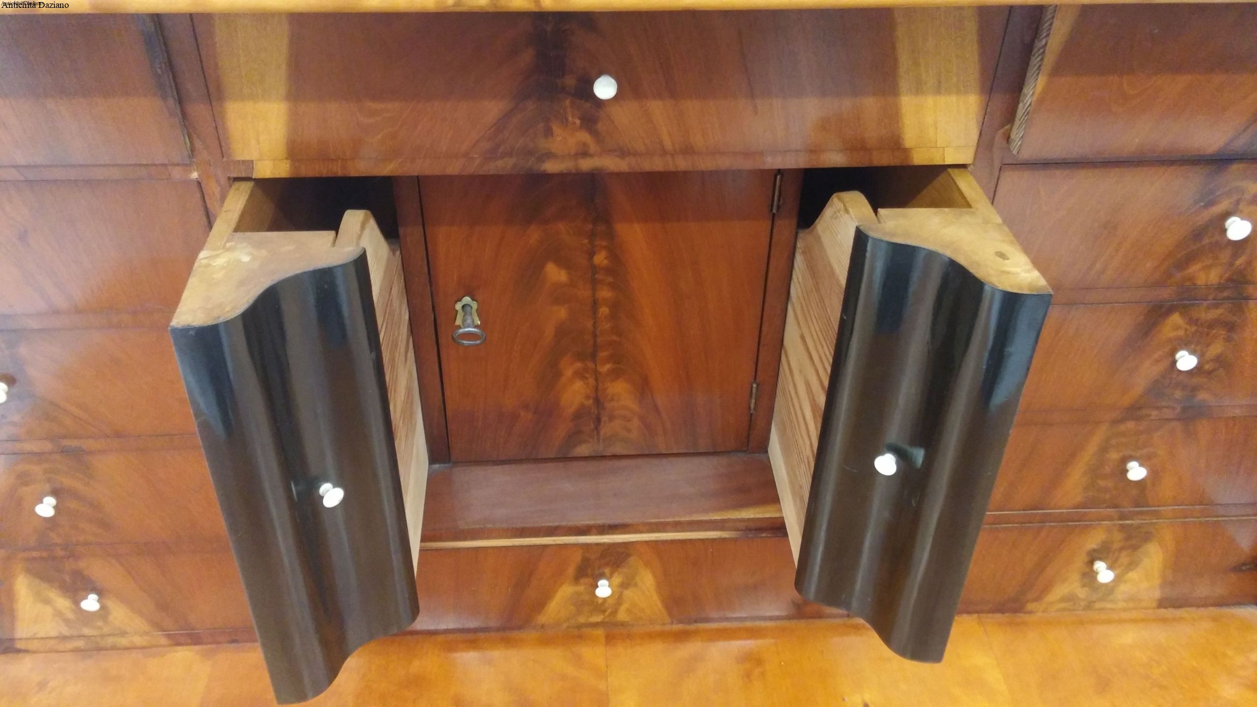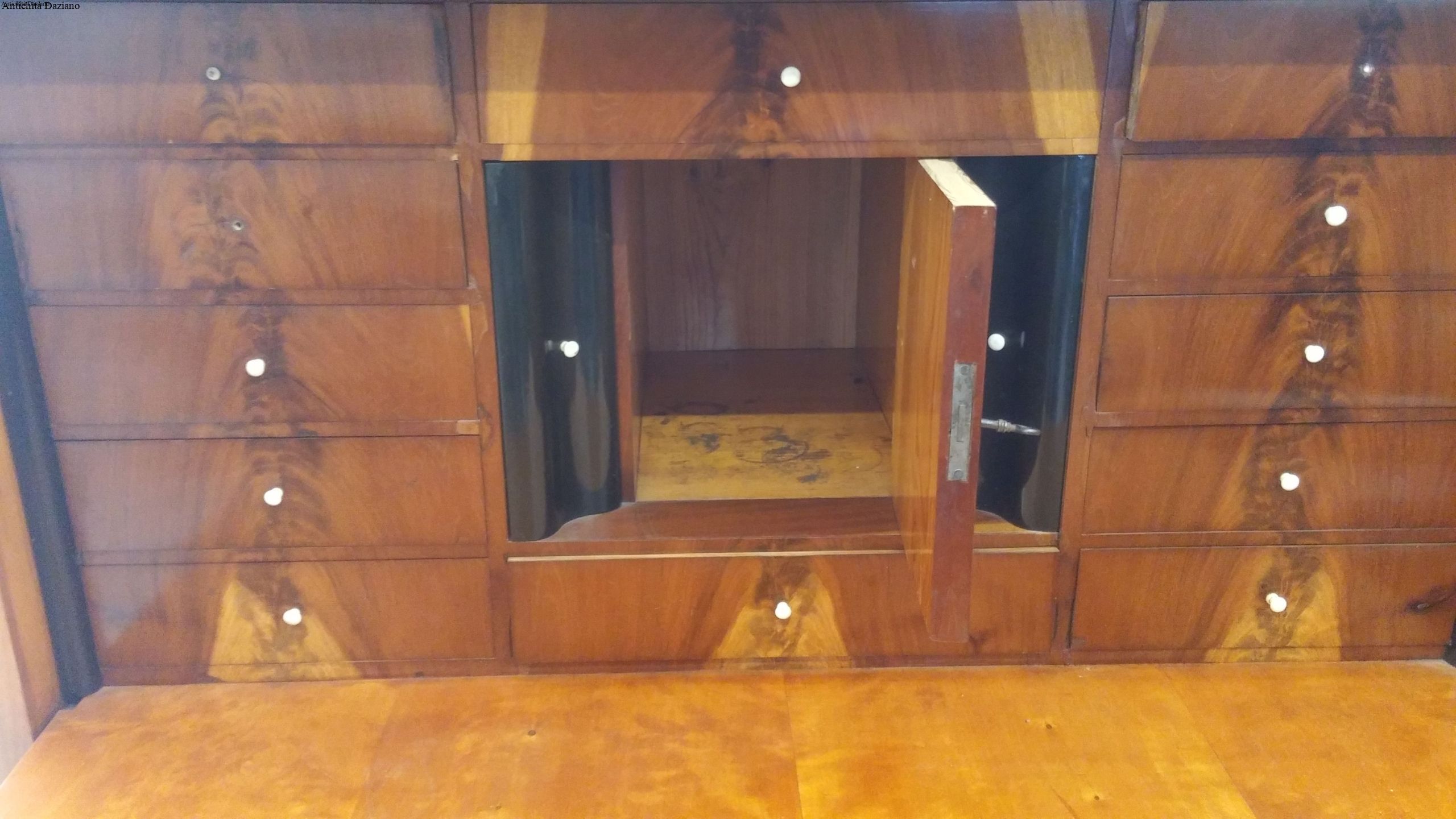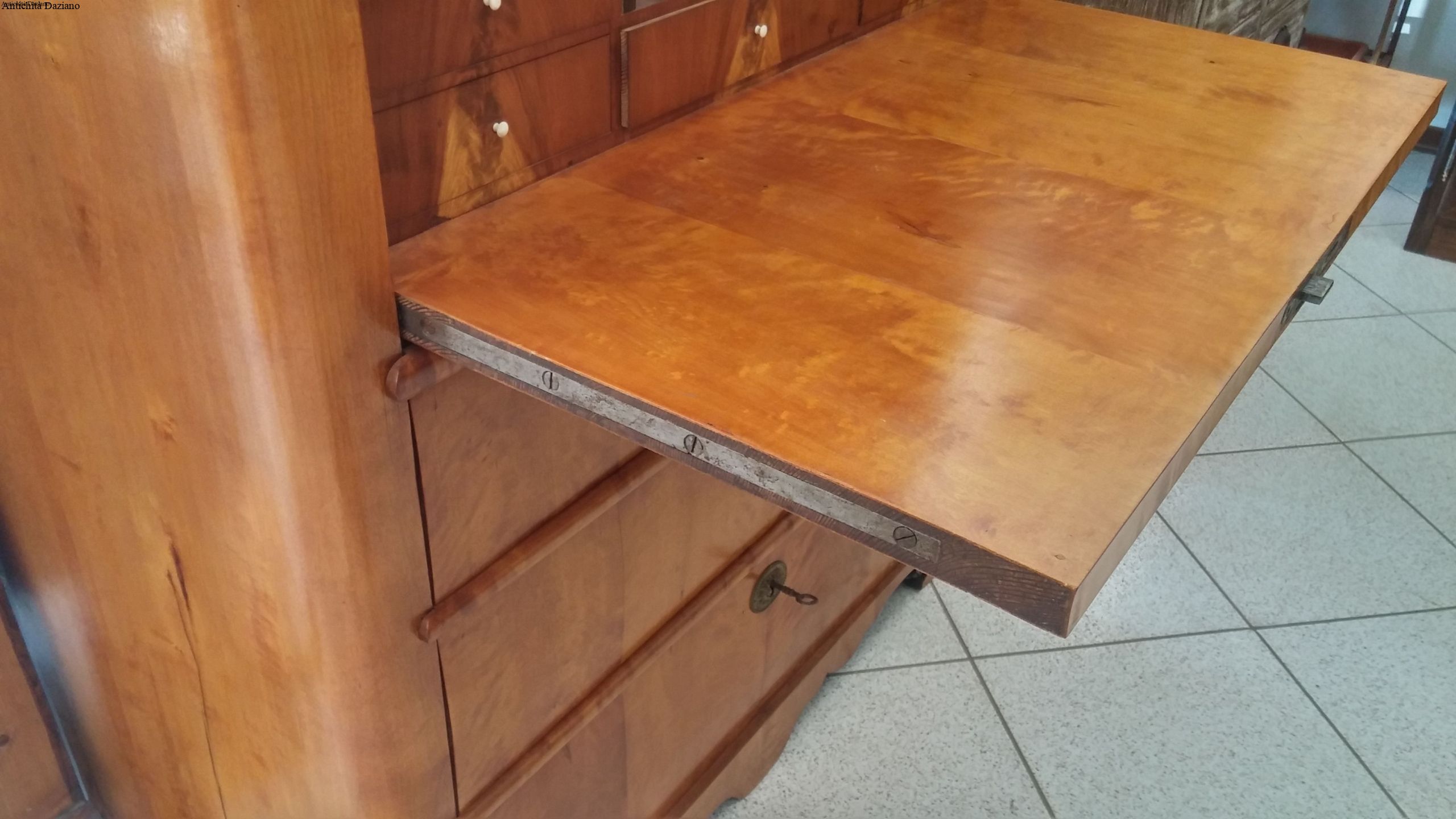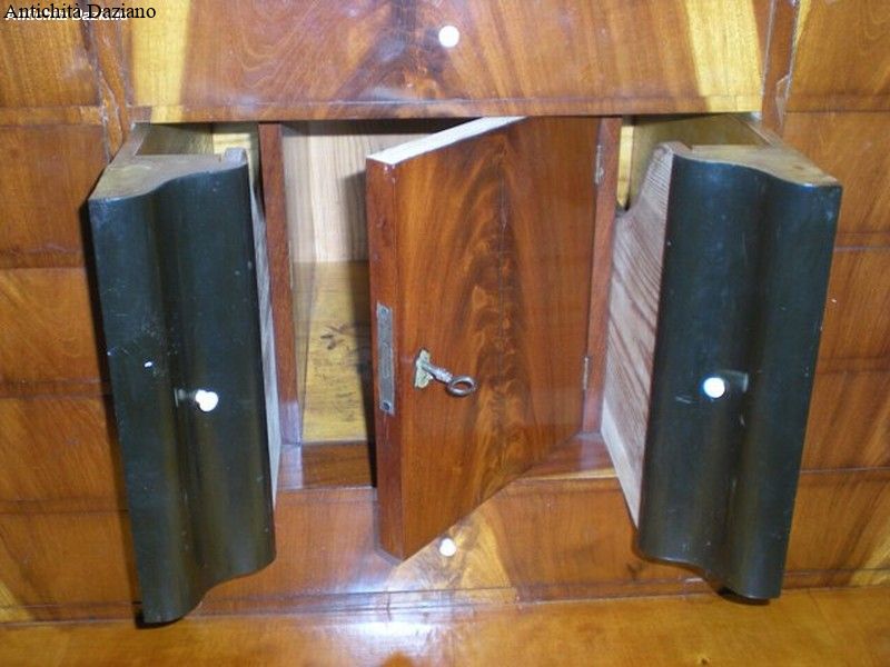 Larghezza 108 cm max – Profondità con ribalta chiusa 48 cm – Profondità con ribalta aperta 91 cm  – Altezza 145 cm.