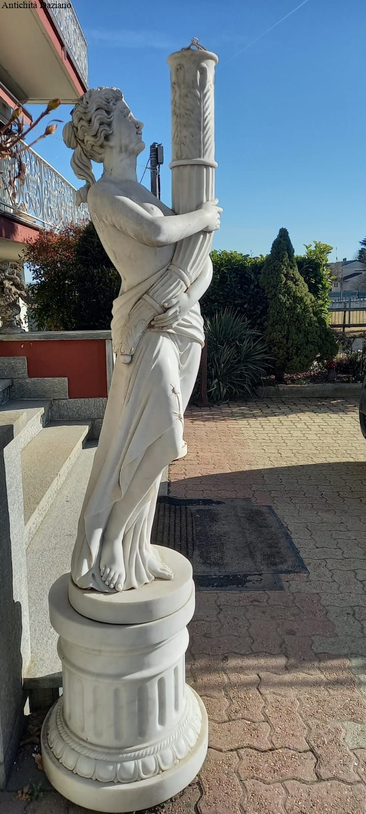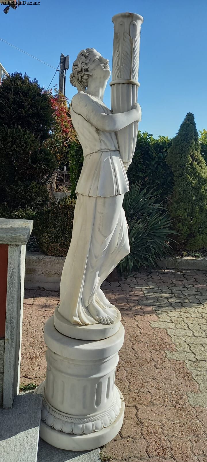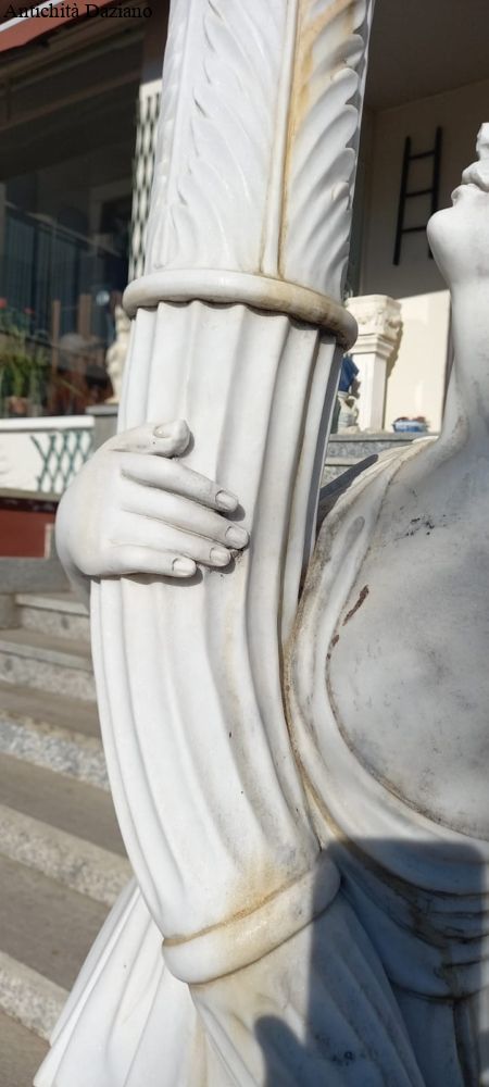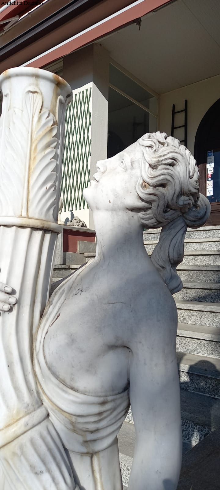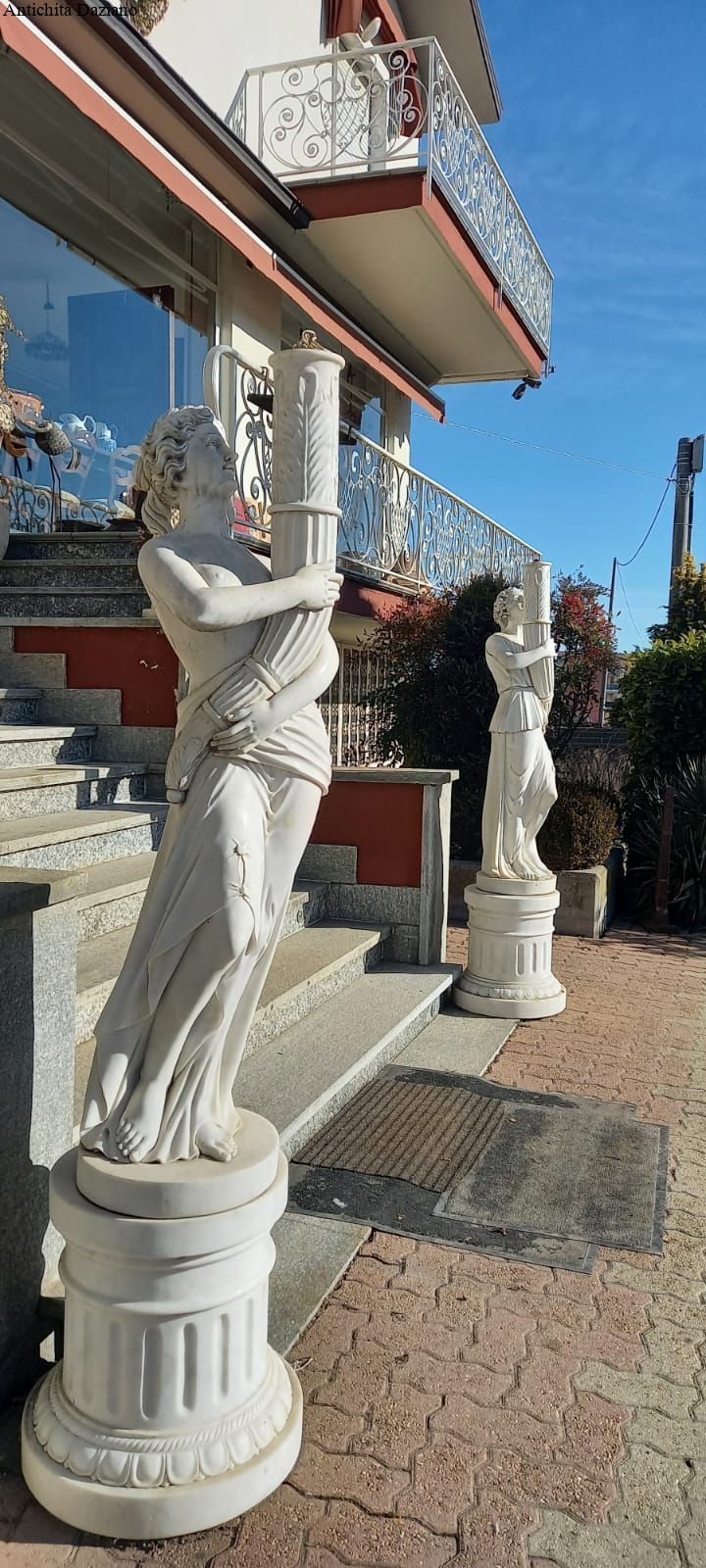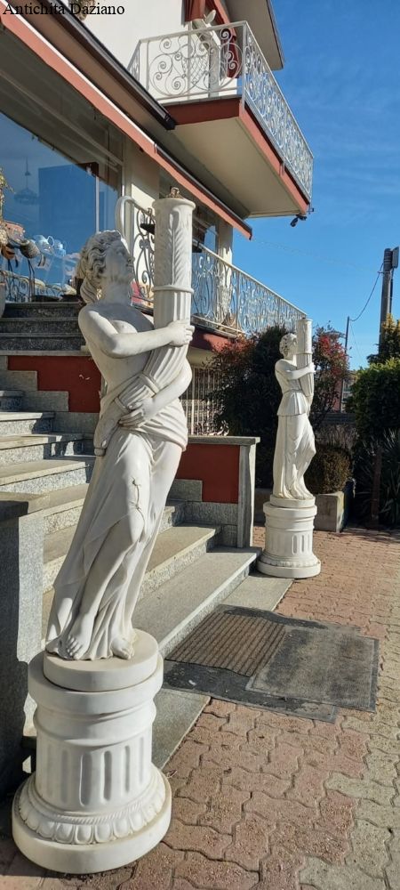 coppia di statue in marmo bianco, piedistallo con scalanature