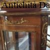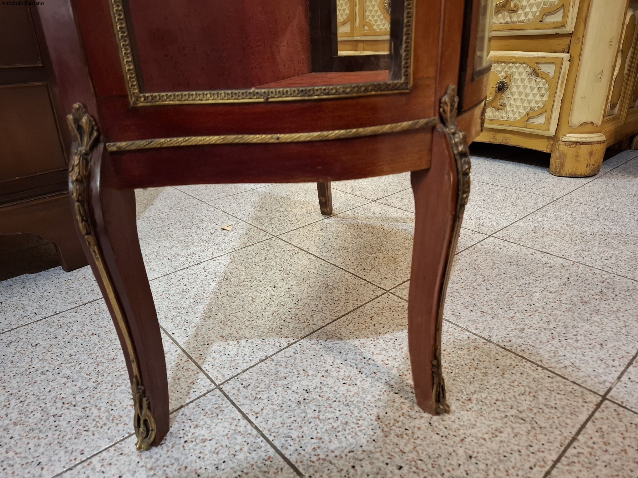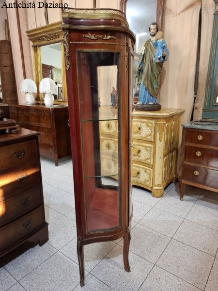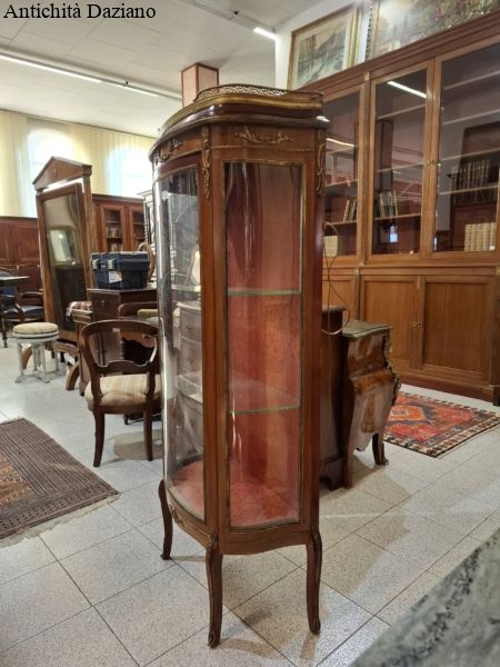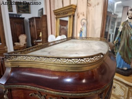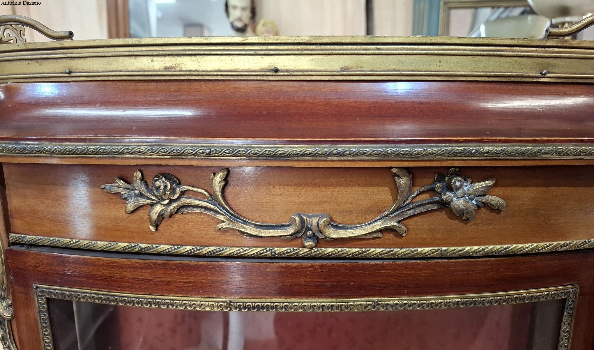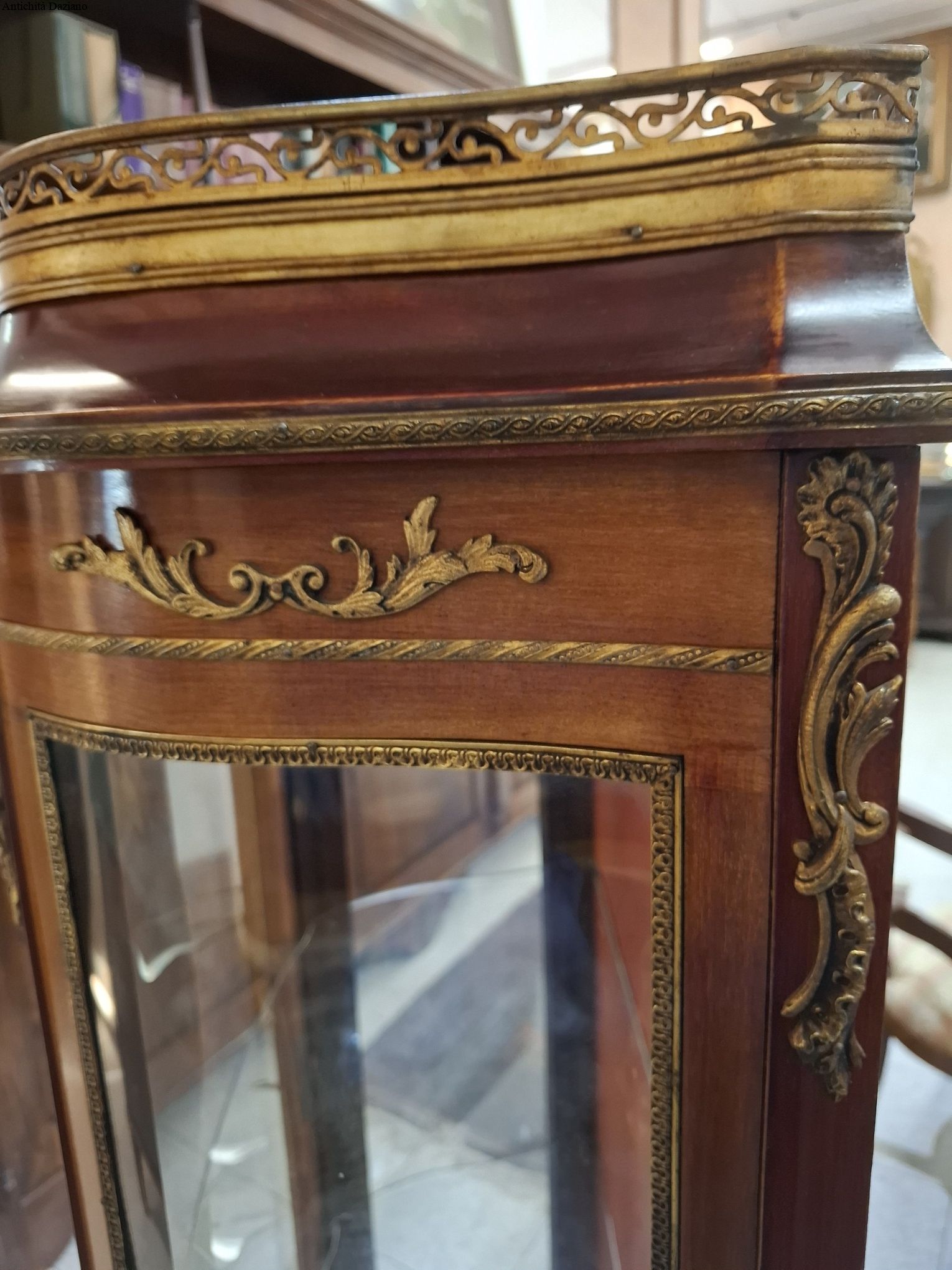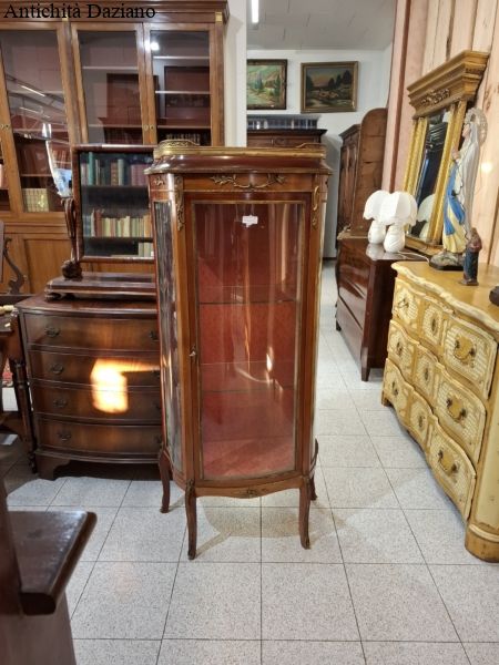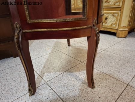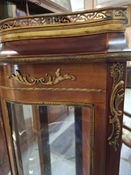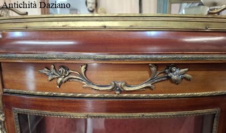 lastronata mogano con bronzi, marmo sulla parte superiore, vetri curvi e due piani originali.