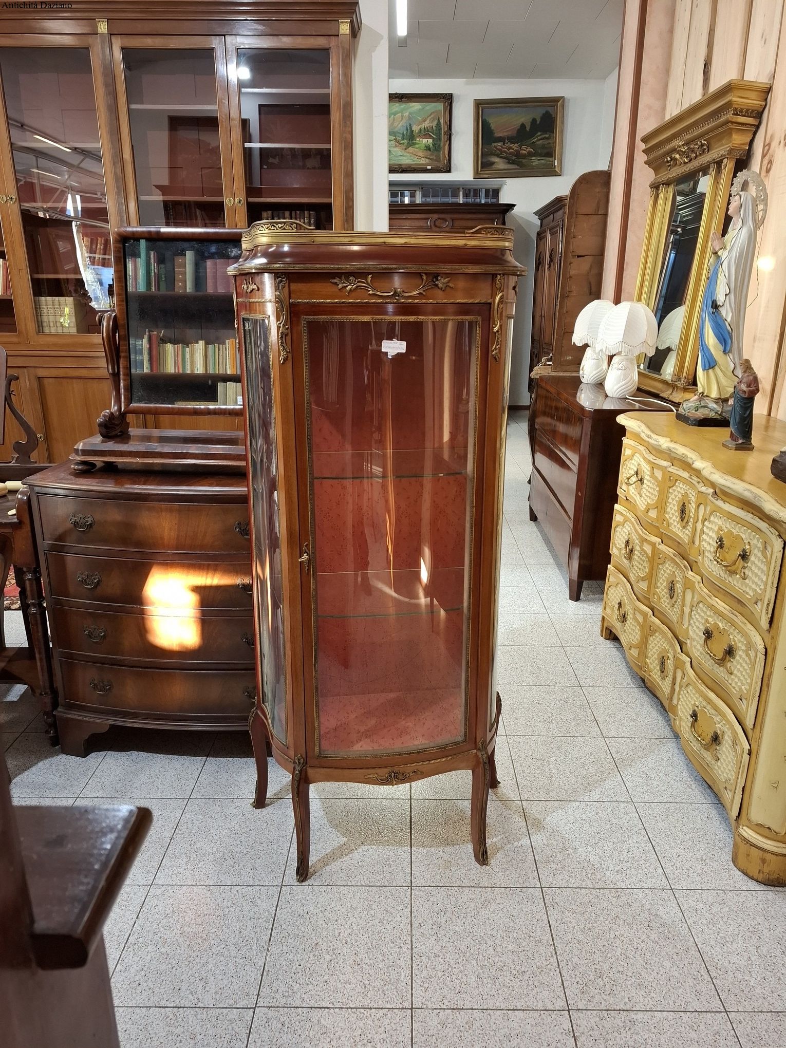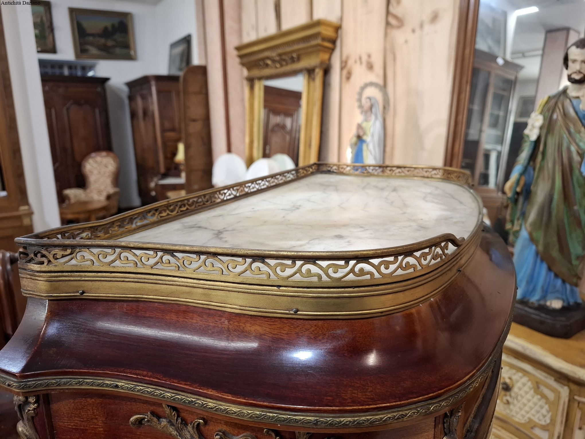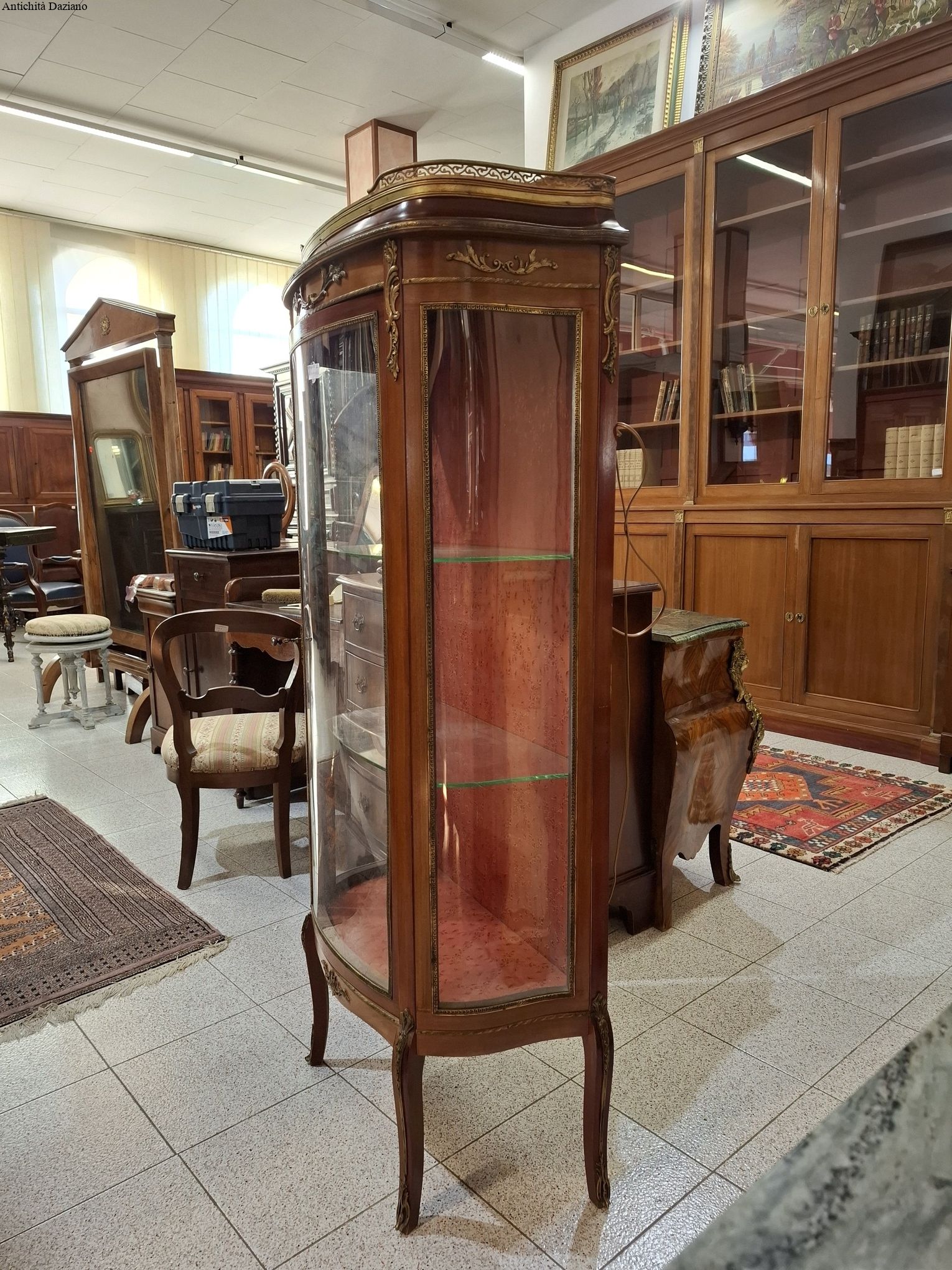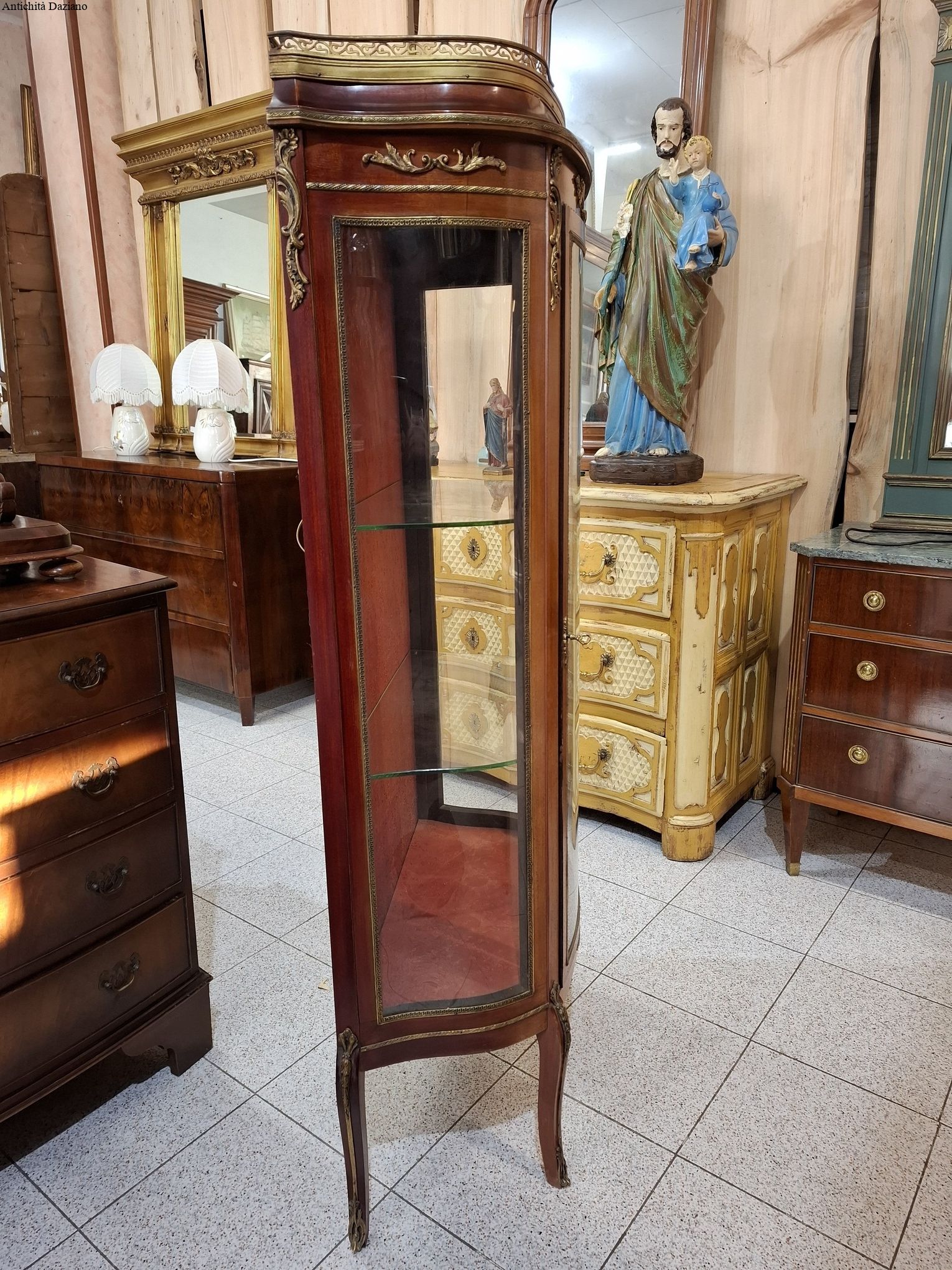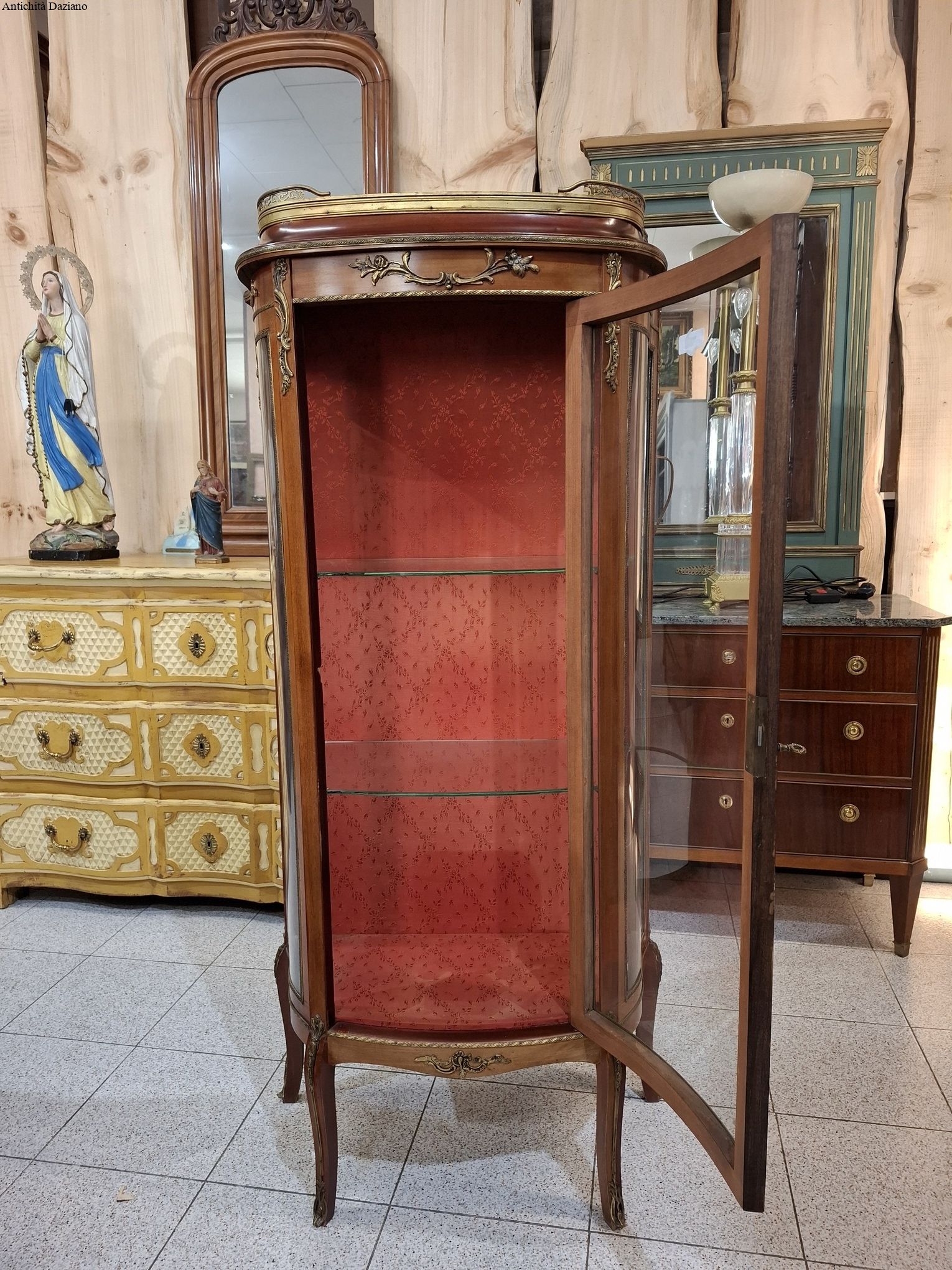 lastronata mogano con bronzi, marmo sulla parte superiore, vetri curvi e due piani originali.